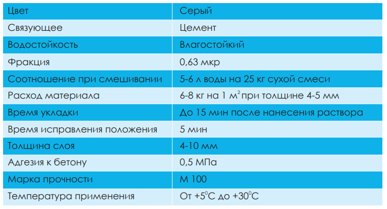 Кладочный клей морозостойкий, влагостойкий на основе цемента, фракционного песка и комплекса химических добавок.