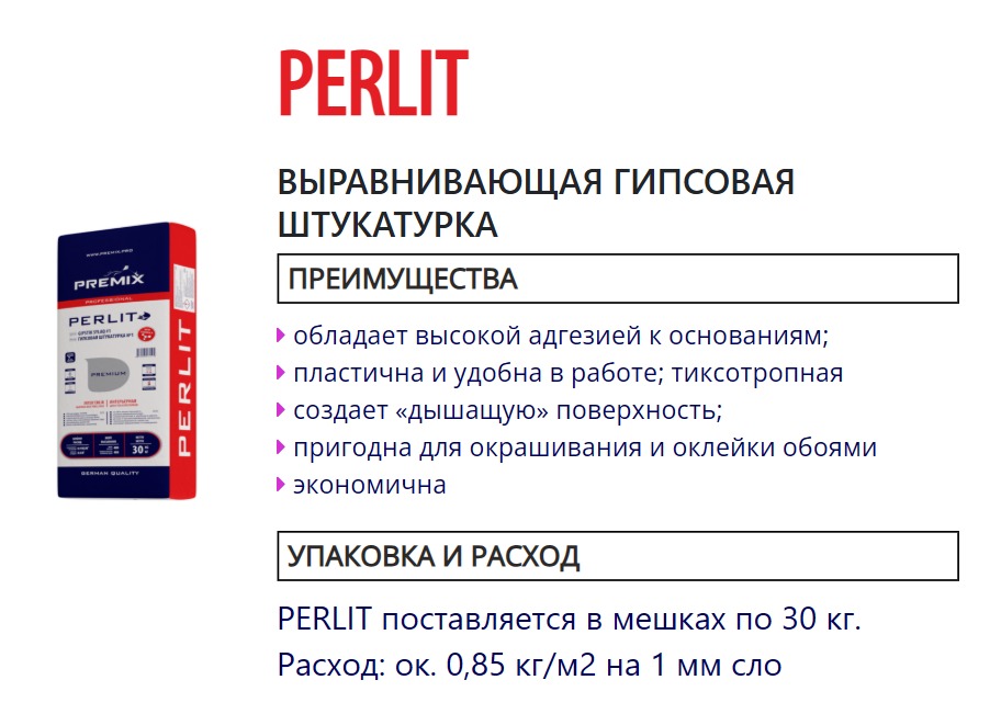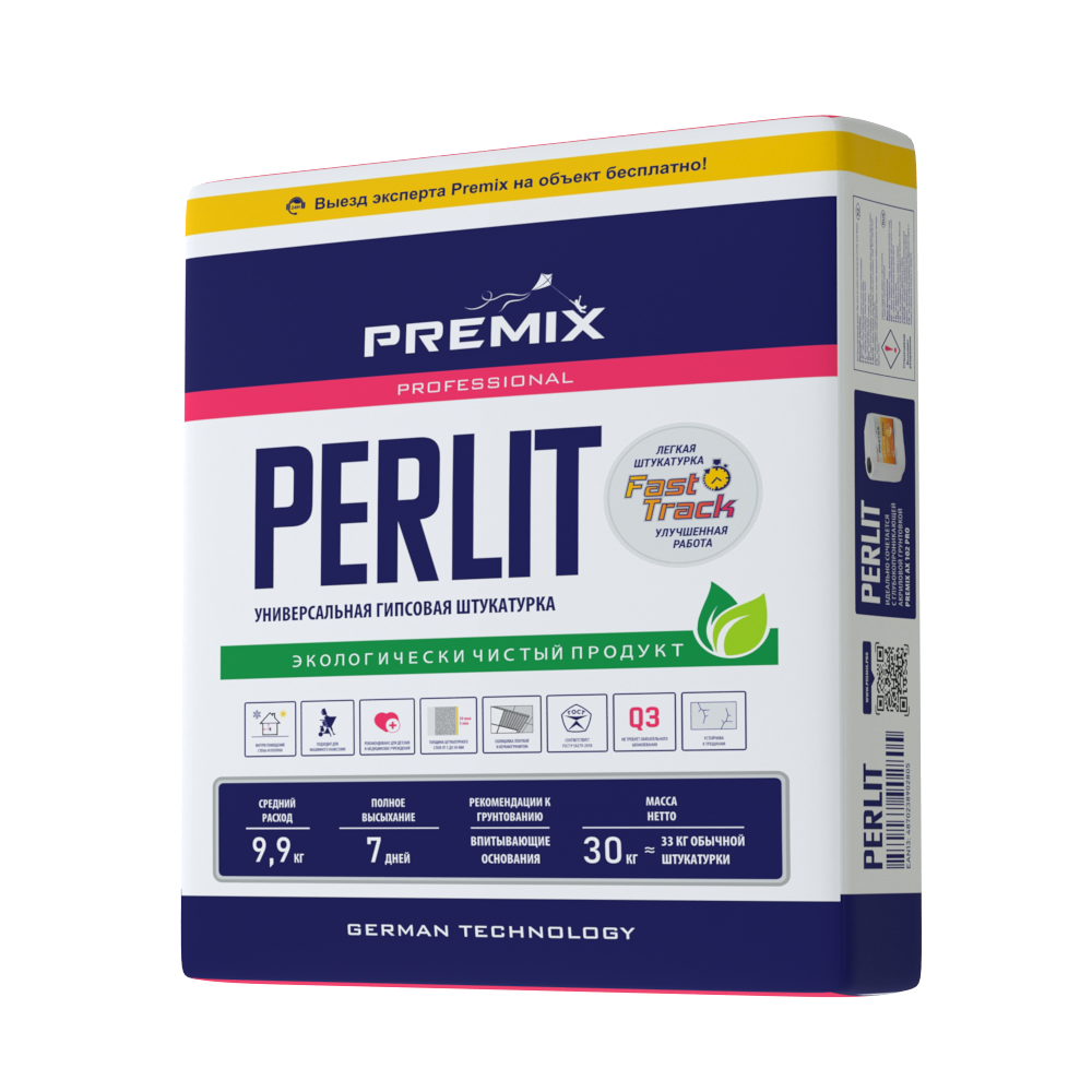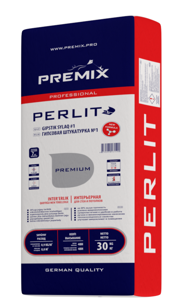Гипсовая штукатурка Premix Perlit предназначена для высококачественного оштукатуривания потолков и стен из бетона, кирпича, цементной штукатурки, поверхностей из пенополистирола, ЦСП.